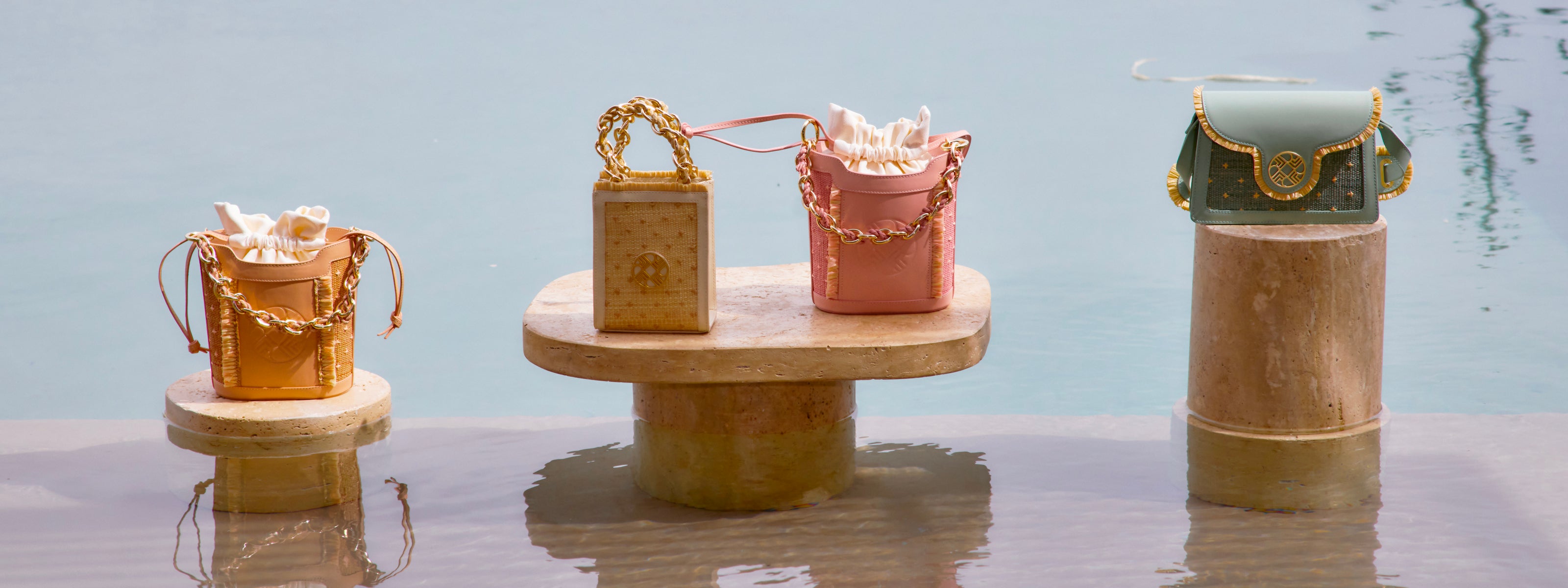 Le travail manuel des fibres naturelles est au coeur des collections. Elles sont sublimées par une broderie faite main et renforcées par le travail de maroquinnerie haut de gamme au sein de notre atelier.